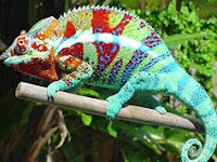 Камуфляжна форма добре підходить для маскування серед кущів, рослинності, але може зрадити, коли довкілля рівномірно забарвлене, як, наприклад, пісок на пляжі. Для хамелеона зміна забарвлення довкілля не є проблемою. Він дивує нас не лише тим, що може розглядати предмети, рухаючи одним оком незалежно від іншого. Ще він вистрілює язиком на відстань у півтора рази довшу за своє тіло! До його язика можуть приклеїтися не лише комахи, але й дрібних птахи та ящірки. Хамелеон Джексона, приміром, як і всі його родичі, може змінювати забарвлення шкіри. За 1–2 хвилини він може стати жовтим, червоним, бурим, сірим чи навіть синім. Зміна забарвлення – не що інше, як „військова хитрість”, яка допомагає тваринам не стати жертвами або, надійно замаскувавшись у засідці, вполювати іншу необачну тварину.